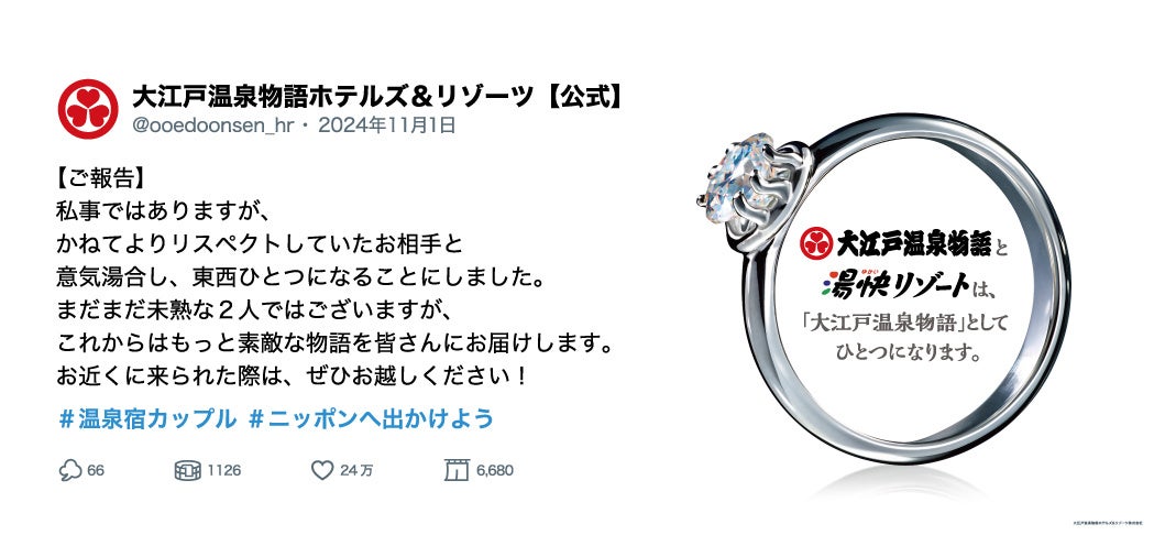 広告デザインは、この度の統合を経て大江戸温泉物語と湯快リゾートがひとつになることを「結婚報告」になぞらえてユーモラスに表現しています。また、SNS投稿をモチーフに、大江戸温泉物語の「統合報告」と湯快リゾートの「統合報告」の2種類掲出いたします。