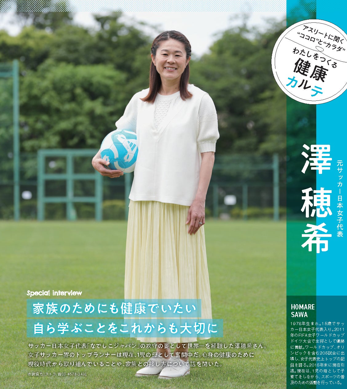 サッカー日本女子代表「なでしこジャパン」の攻守の要として、世界一の栄冠を手にした澤穂希さん。現在、1児の母として子育てに励みながら、心身の健康維持や家族との関わりについても積極的に取り組んでいます。今回は、現役時代から続けている心身の健康維持の方法や、家族との関わり方についてお話を伺いました。