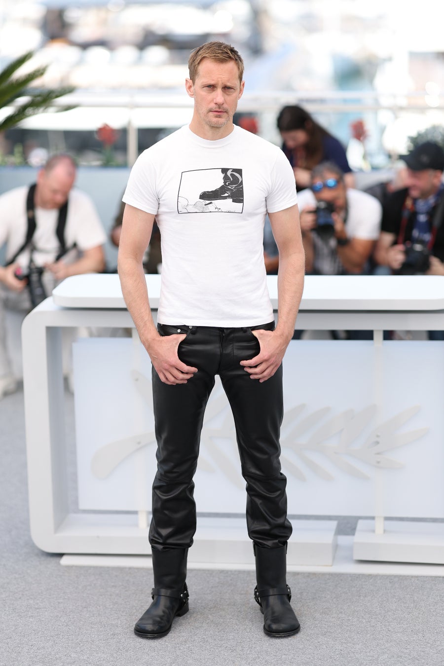 アレクサンダー・スカルスガルドは《Pillion(原題)》のフォトコールにて、ナパラムスキンのレザーパンツと「カンポ」バイカーブーツを着用しました。