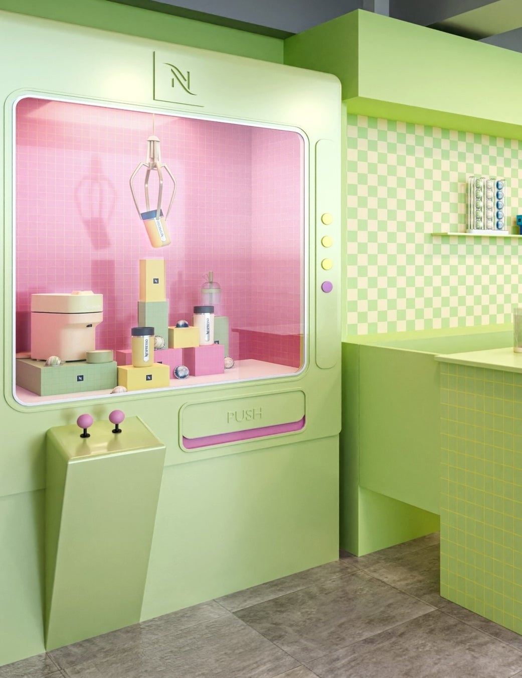 テーマカラーである「ピスタチオ」や「パステルイエロー」をベースにした空間デザインは、90年代を想わせるノスタルジックでレトロな世界観を表現。来場者には、この夏に新登場した、豊かなナッツの風味が香る「ピスタチオ バニラ フレーバー オーバー アイス」、ココナッツとバニラの風味がさわやかに香る「ココナッツ バニラ フレーバー オーバー アイス」をはじめ、ミルクレシピを含む6種類のアイスコーヒーを無料で提供します。ネスプレッソ独自の抽出方法「セントリフュージョン(遠心力抽出法)」を採用した「ヴァーチュオ」システムのコーヒーメーカーで抽出した、たっぷりとしたクレマ(※1)と芳醇なアロマが特長の本格的な味わいを楽しむことができます。