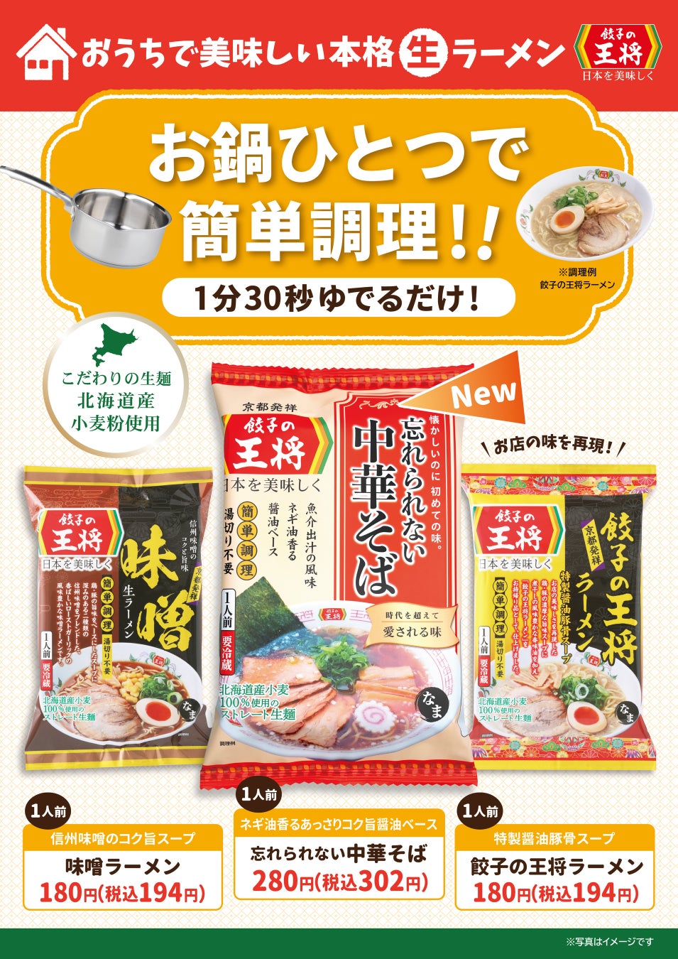 「餃子の王将」を運営する株式会社王将フードサービス(京都市山科区/代表取締役社長 渡邊 直人)は、自宅で簡単に美味しい本格生ラーメンをお楽しみいただけるラーメンパックを店頭にて販売しております。