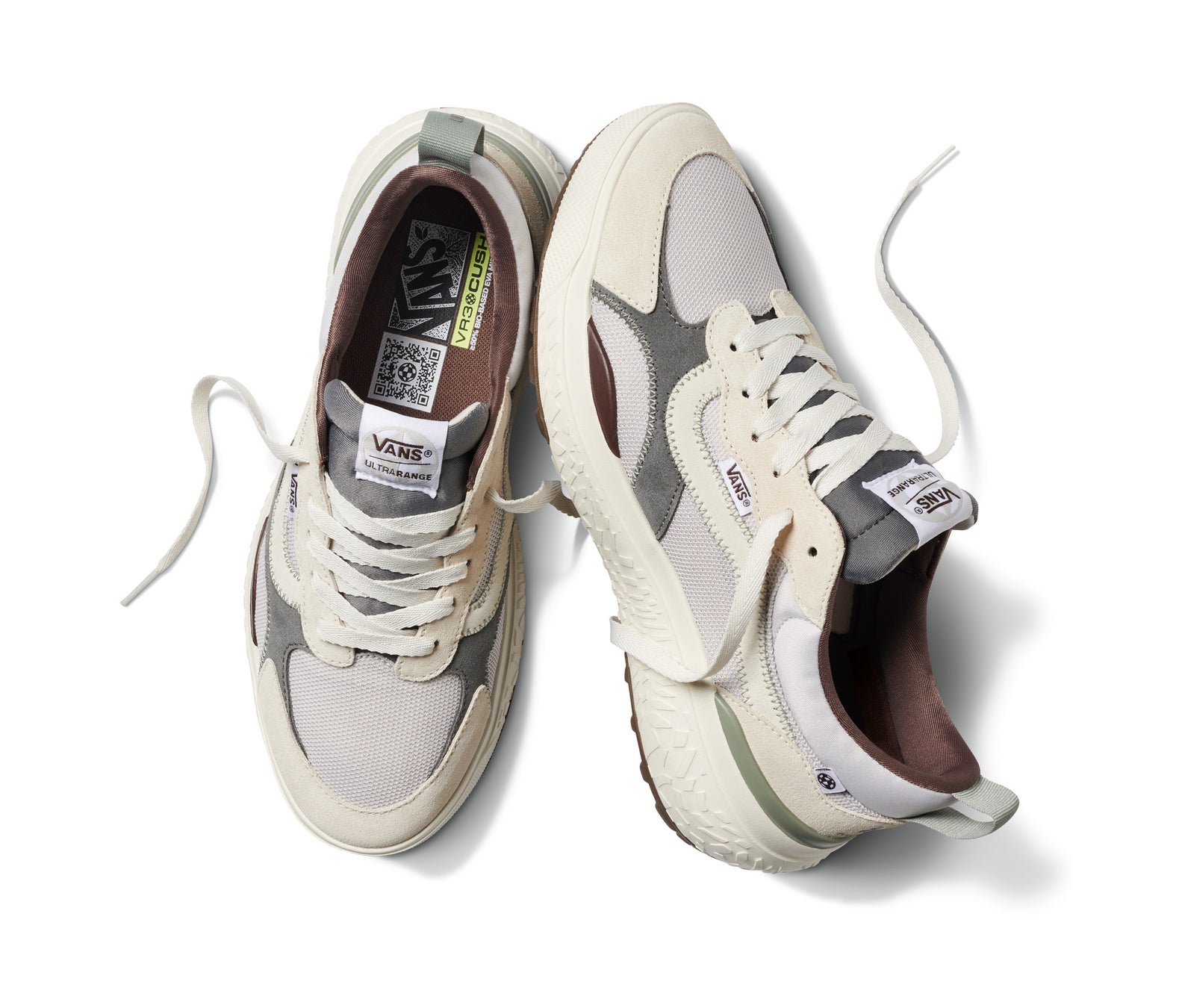 印象的なデザインとサステナブルな素材を使⽤した「ULTRARANGE NEO VR3」は、快適性とサポート性能に優れたシューズです。リッチなブラウンと光沢のあるブラックのカラーリングを採⽤したサーフブーツ「SURF BOOT 2 HI V」や、 ヒール部分が倒れ、踏みつけながら履くことができる「AUTHENTIC VR3」など、計4モデルのフットウェアが登場します。