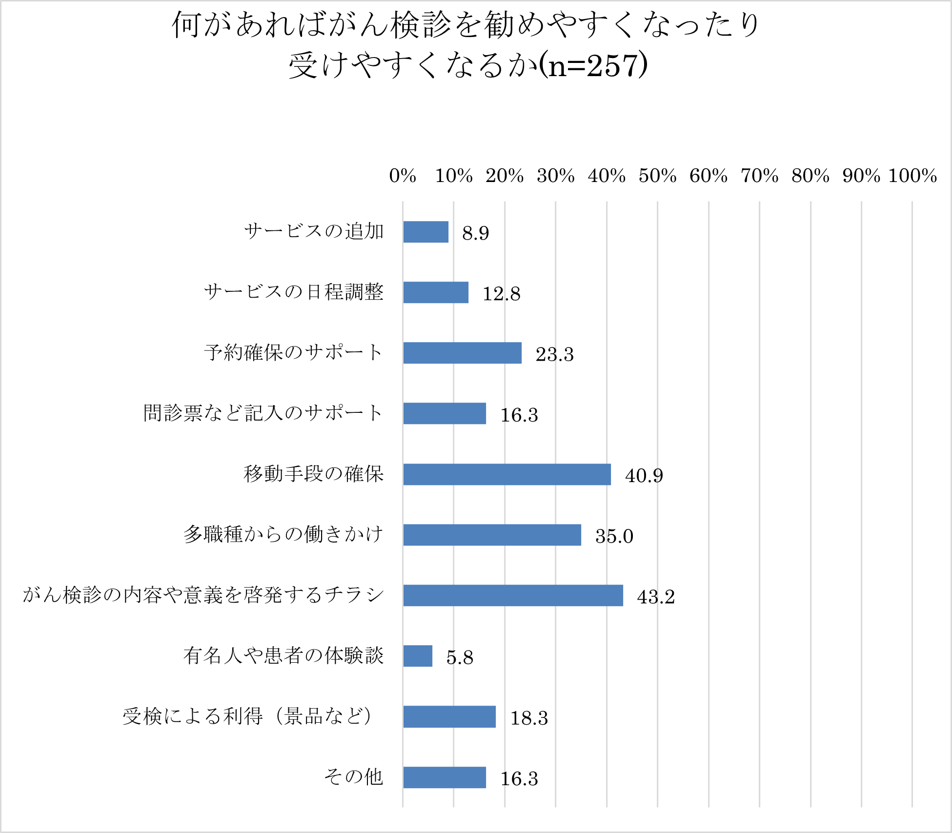 また、「がん検診の内容や意義を啓発するチラシ」があれば勧めやすくなったり、利用者やその家族ががん検診を受けやすくなると回答したケアマネジャーも多くいました。