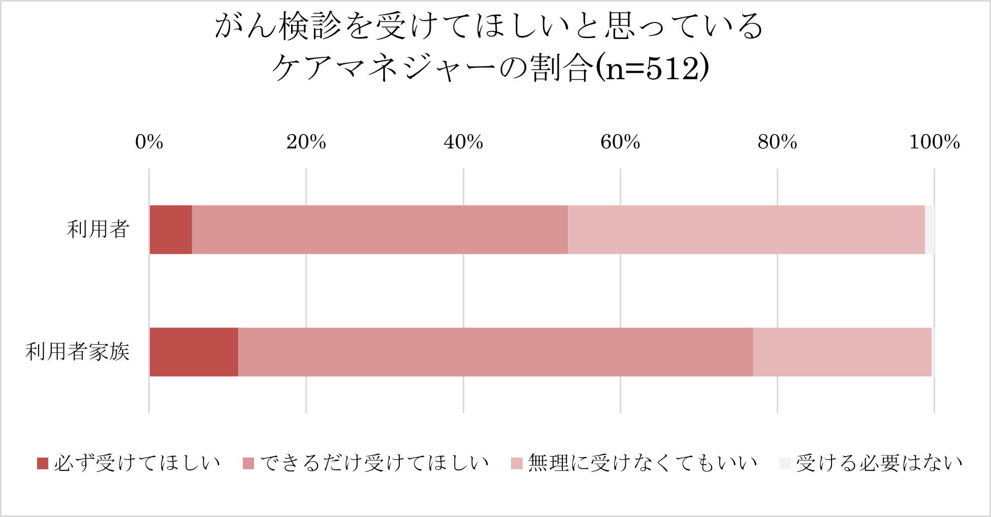 しかし、一方で、半数以上のケアマネジャーが、利用者とその家族どちらにおいてもがん検診を全く勧めていないことが明らかになりました。