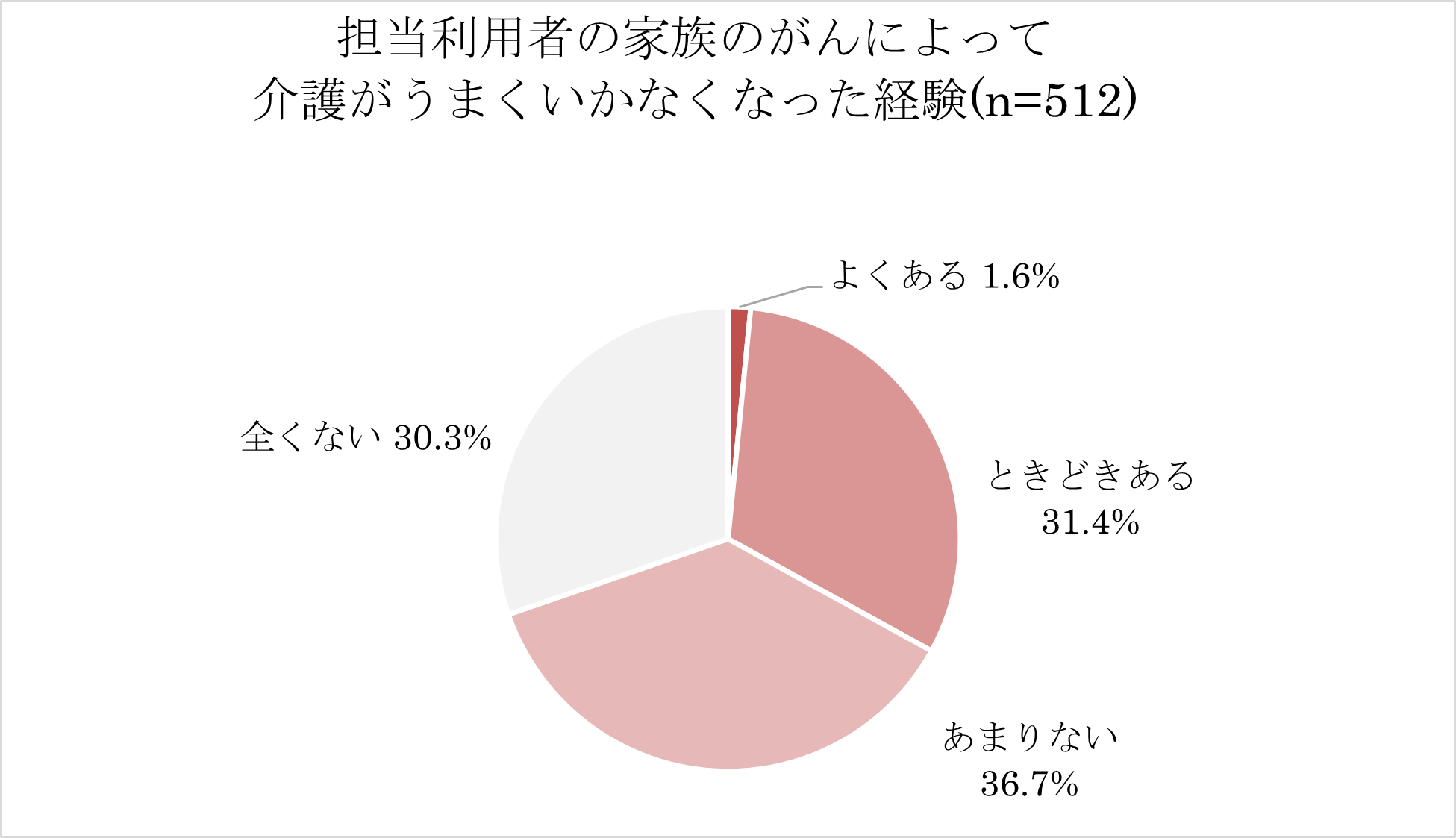 その結果、利用者家族のがんによって介護がうまくいかなくなった経験があるケアマネジャーは約7割を占め、利用者本人だけでなく家族のがんもケアマネジャーにとって身近な問題であることが分かりました。