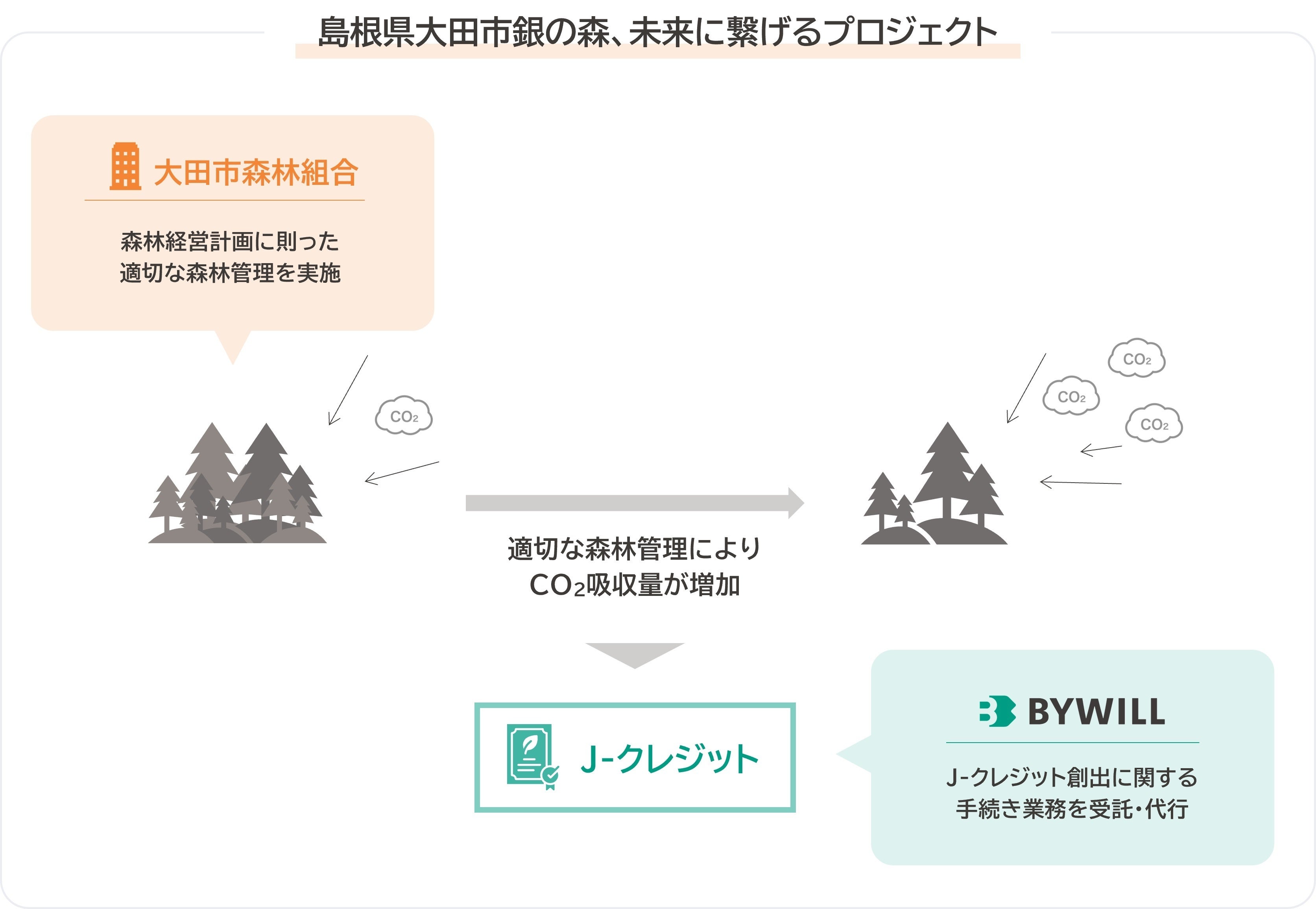 本プロジェクトでは、大田市森林組合の森林管理によって増加した二酸化炭素吸収量を、バイウィルが手続きを受託・代行してJ-クレジットに換えます。そして、その売却による収益は、大田市森林組合が安定した森林保全を継続するために活用されます。