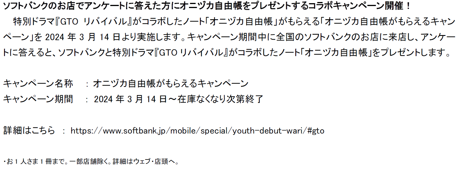 特別ドラマ『GTOリバイバル』がコラボしたノート「オニヅカ自由帳」がもらえる「オニヅカ自由帳がもらえるキャンペーン」を2024年3月14日より実施します。キャンペーン期間中に全国のソフトバンクのお店に来店し、アンケートに答えると、ソフトバンクと特別ドラマ『GTOリバイバル』がコラボしたノート「オニヅカ自由帳」をプレゼントします。