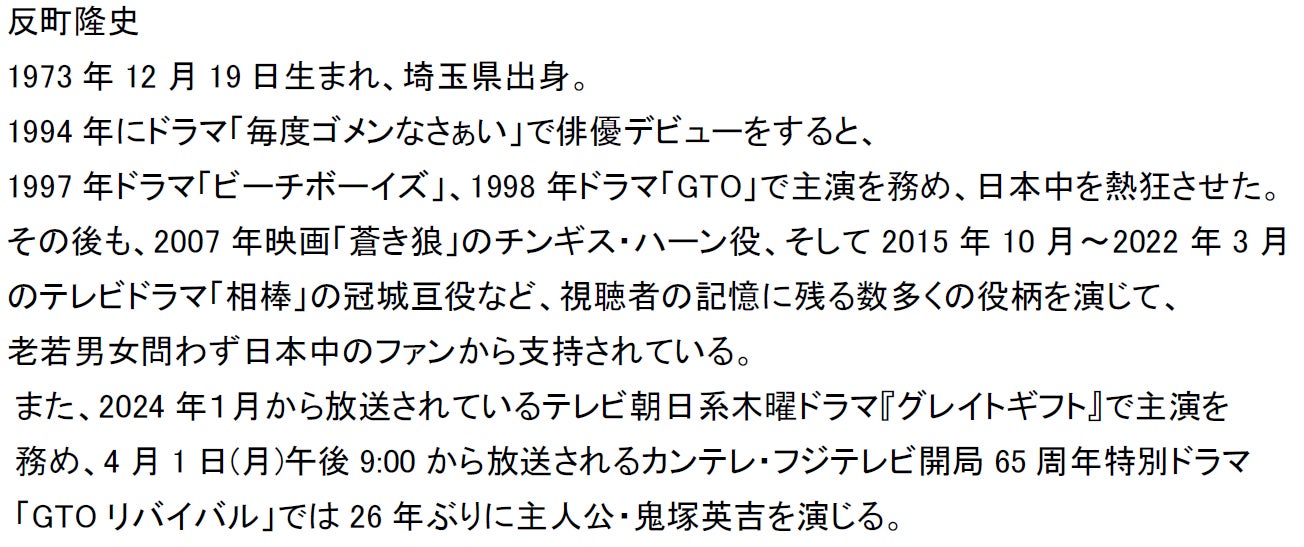 俳優の反町隆史(そりまちたかし)さんが主人公「鬼塚英吉」を演じた大ヒットドラマ「GTO」が、カンテレ・フジテレビ開局65周年特別ドラマ「GTOリバイバル」として26年ぶりに復活するとともに、鬼塚英吉がソフトバンクのCMにも初登場します。