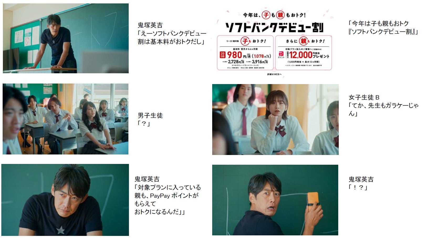 教壇に立つ鬼塚英吉がスマートフォンをまだ持っていない生徒に対し、親への説得材料として、おトクな「ソフトバンクデビュー割」の魅力について授業をするストーリー。「ソフトバンクデビュー割」について教えようとする鬼塚英吉は、教室の隅に置いてある「ソフトバンクデビュー割」の説明ボードを棒読みしていたり、「先生もガラケーじゃん!」と生徒に突っ込まれ「しまった!」という表情を浮かべたり、ドラマとは一味違う(?)鬼塚英吉の様子や、学生服を身にまとった白戸家のお父さんの姿にご注目ください。