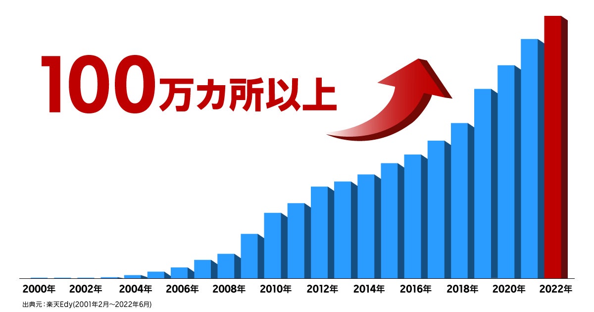 キャッシュレス決済のパイオニアである「楽天Edy」は、2001年に「Edy」としてサービスを開始(注1)、2012年にサービス名称が「楽天Edy」となりました。「Edy」サービスの開始前に実施した実証実験時(注2)では、利用可能箇所は全165カ所(40店舗・自動販売機125台)のみでしたが、現在は、飲食店、コンビニエンスストア、スーパーマーケット、ドラッグストアなどの楽天Edy加盟店で支払いに利用することができ、このたび利用可能箇所数が100万カ所を突破しました。