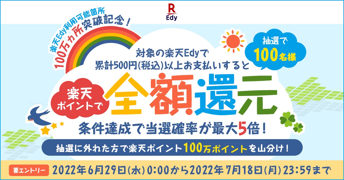 楽天ペイメント株式会社(本社:東京都港区、代表取締役:中村 晃一、以下 「楽天ペイメント」)と楽天Edy株式会社(本社:東京都港区、代表取締役社長:和田 圭、以下 「楽天Edy」)は、電子マネー「楽天Edy」の利用可能箇所数が100万カ所(2022年6月1日時点)を突破したことを記念して、本日6月29日(水)から7月18日(月)まで「100万カ所突破記念キャンペーン」を実施します。