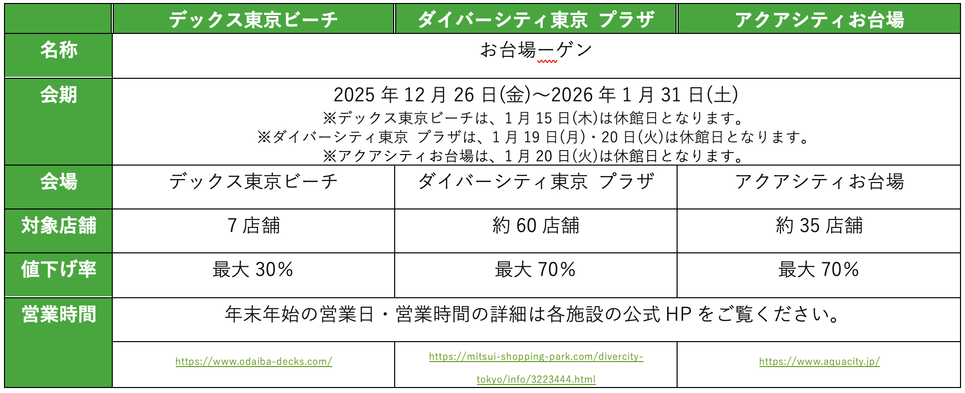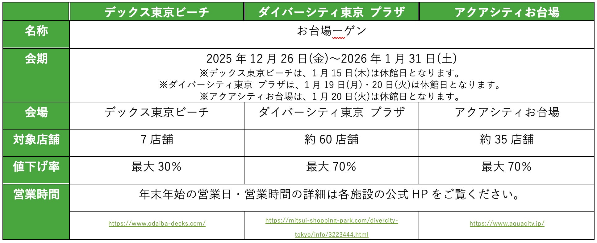 デックス東京ビーチ(運営:東急不動産SCマネジメント株式会社)、ダイバーシティ東京 プラザ(運営:三井不動産商業マネジメント株式会社)、アクアシティお台場(運営:三菱地所プロパティマネジメント株式会社)の大型商業施設3施設では、お台場エリアを盛り上げるべく、この冬から「ODAIBA FUN ISLAND(お台場ファンアイランド)」を始動。3施設それぞれ、お買い上げレシートでプレゼントが当たるキャンペーンや、人気キャラクターとコラボレーションした体験型イベントのほか、2025年12月26日(金)から2026年1月31日(土)までの期間限定で、毎年恒例となった合同バーゲン「お台場ーゲン」を同時開催します。