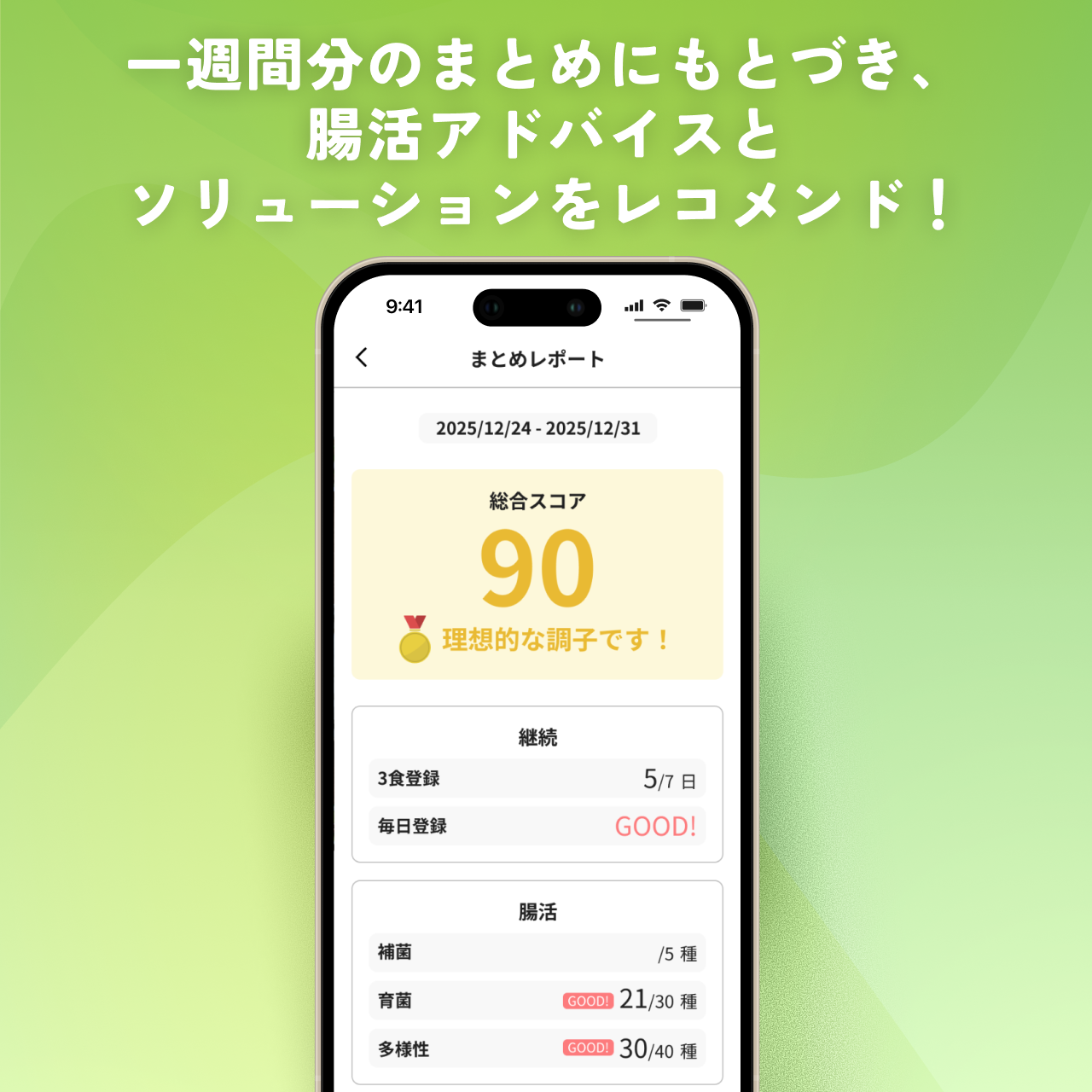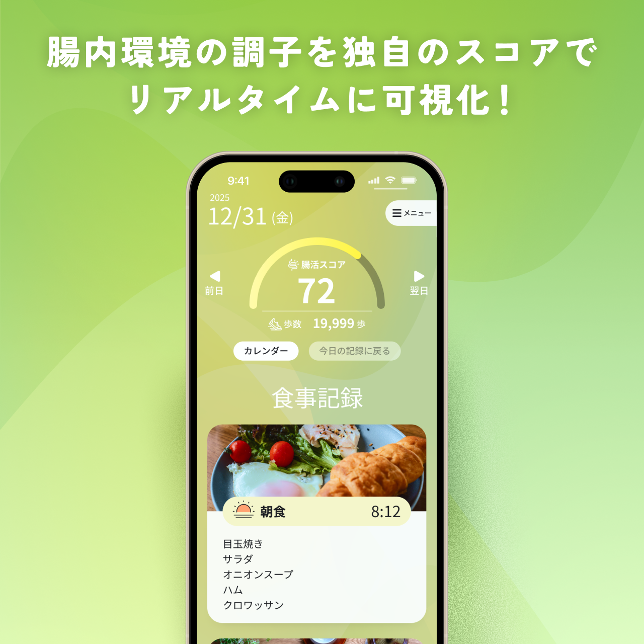 ・日々の記録内容から、栄養バランス、補菌・育菌、運動量などをもとに、「腸活スコア」をリアルタイムに計測。