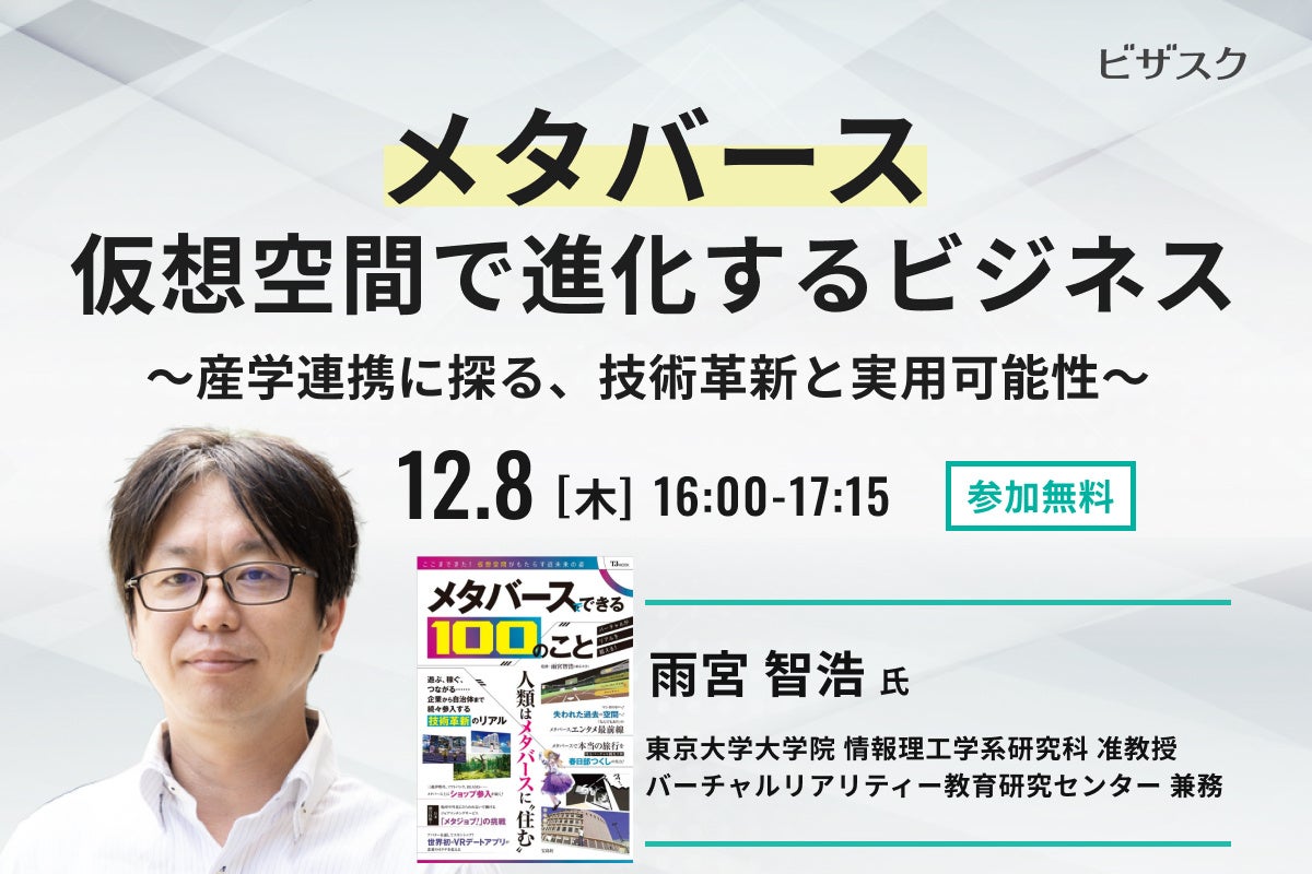「知見と、挑戦をつなぐ」をミッションにグローバルなナレッジプラットフォームを運営する株式会社ビザスク(以下、当社)は、「メタバース 産学連携に探る技術革新と実用可能性」をテーマに、東京大学大学院 情報理工学系研究科 准教授・東京大学バーチャルリアリティー教育研究センター兼務の雨宮 智浩氏のご登壇による無料オンラインセミナーを、12/8(木)16時より開催します。