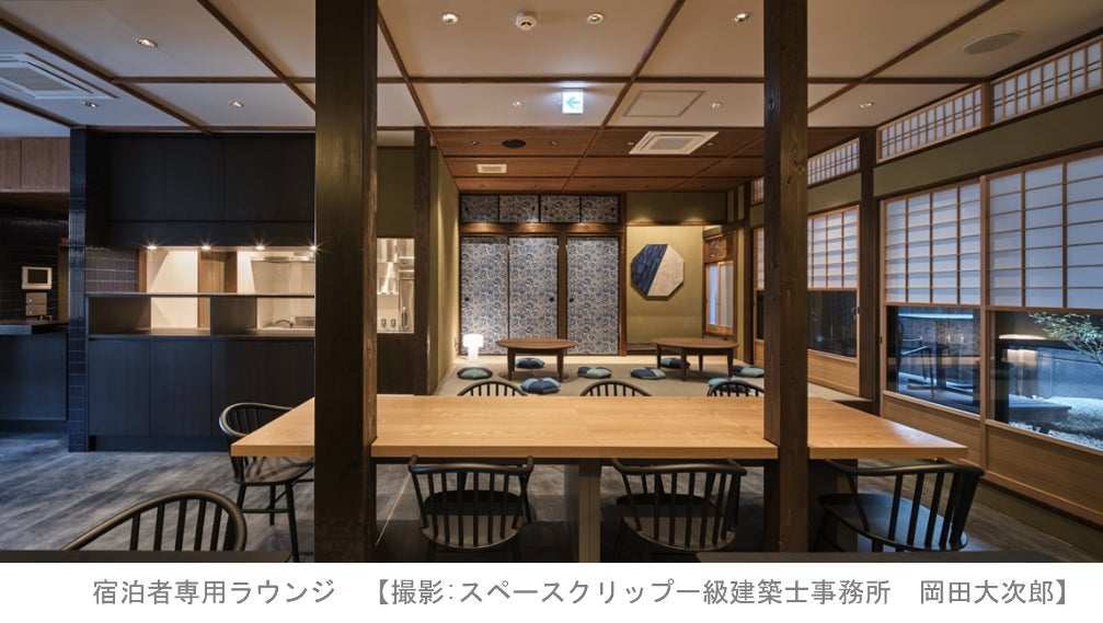 町家棟の1階には宿泊者専用ラウンジを設けており、京町家ならではのエッセンスを保ちつつ洗練されたデザインを施した、贅沢なくつろぎと賑わいのスペースとして活用可能です。お客様が地域の店舗で購入した飲み物や食材を持ち寄り、調理や飲食をしながら交流を楽しめるシェアキッチンの提供も予定しています。