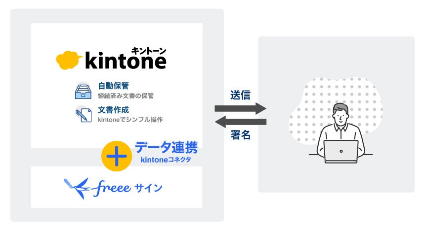 「freeeサイン for kintone」では、kintone上の顧客情報を用いてシームレスに文書送付・契約締結できます。取引相手が文書の受領・署名を行うと、締結された文書はkintone上に自動保管されます。営業部門での申込書、人事部門での一連の雇用契約書やNDAなど、自社で定番の帳票・契約書締結を数多く抱えている方の業務効率化を促進します。