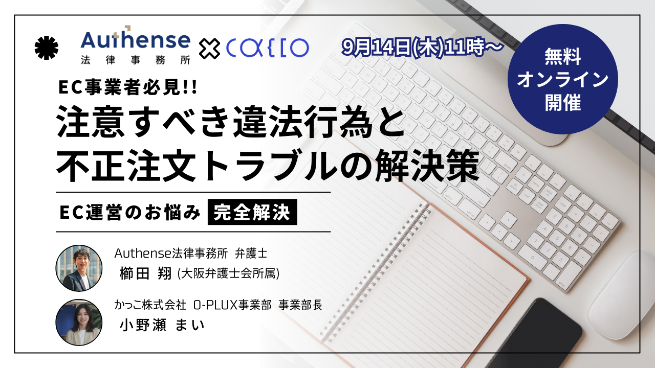 【無料ウェビナー開催2023.9.14】EC事業者必見!!「注意すべき違法行為と不正注文トラブルの解決策」|Authense法律事務所