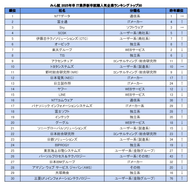 みん就(旧楽天みん就)、「みん就 2025年卒 IT業界新卒就職人気企業ランキング」を発表