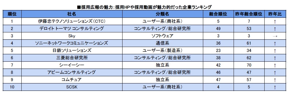 志望理由別ランキング「採用広報の魅力」の項目における「採用HPや採用動画が魅力的だった企業ランキング」では、トップ10にランクインした10社中9社が、昨年より総合順位を上げる結果となりました。