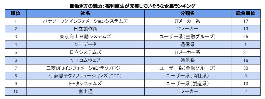 特に、パナソニック インフォメーションシステムズ(昨年総合29位→17位)、日立製作所(昨年総合24位→13位)、NTTコムウェア(昨年総合38位→16位)、三菱UFJインフォメーションテクノロジー(昨年総合76位→30位)など、「福利厚生が充実していそうな企業ランキング」でトップ10にランクインした企業が総合ランキングにおいても大きく順位を上げました。