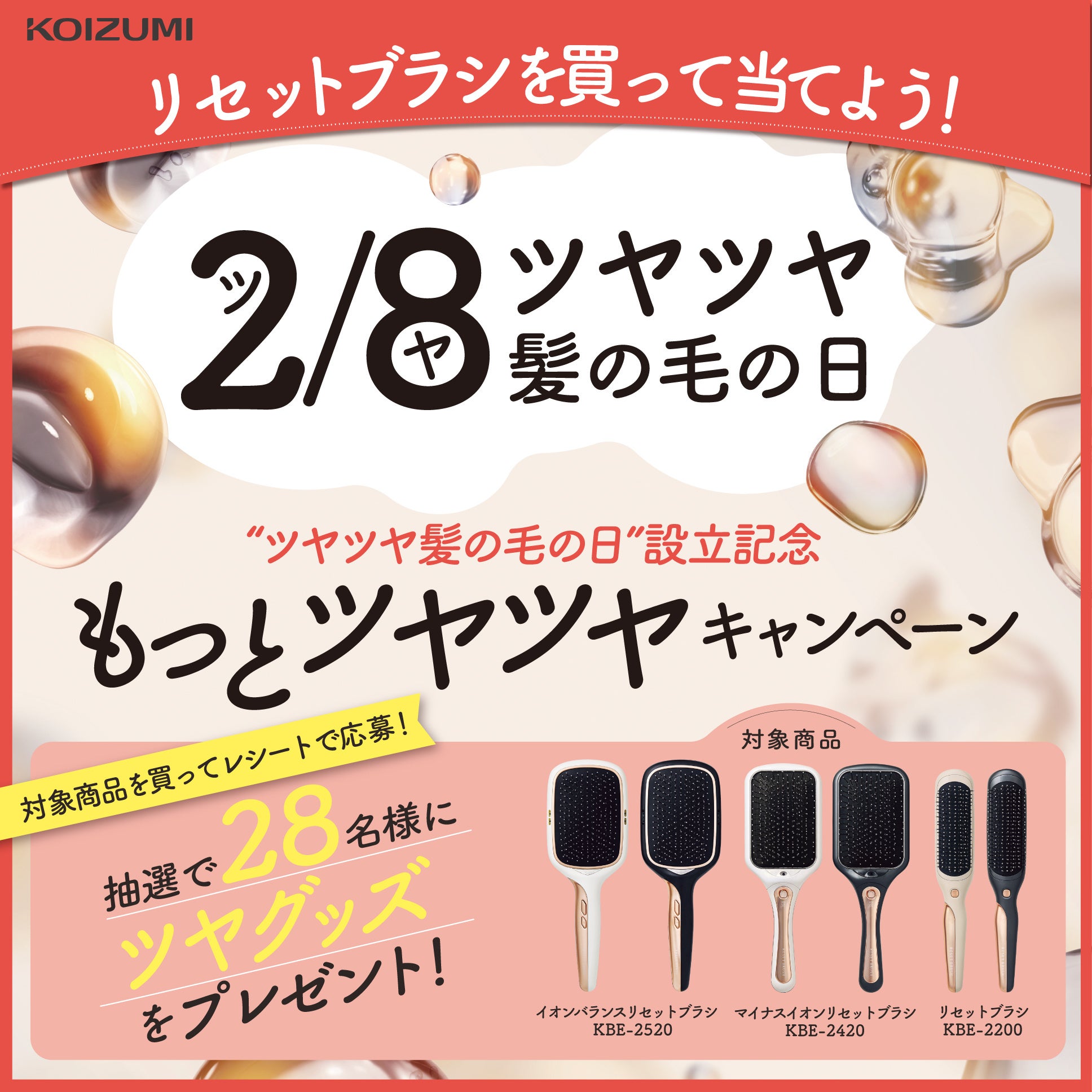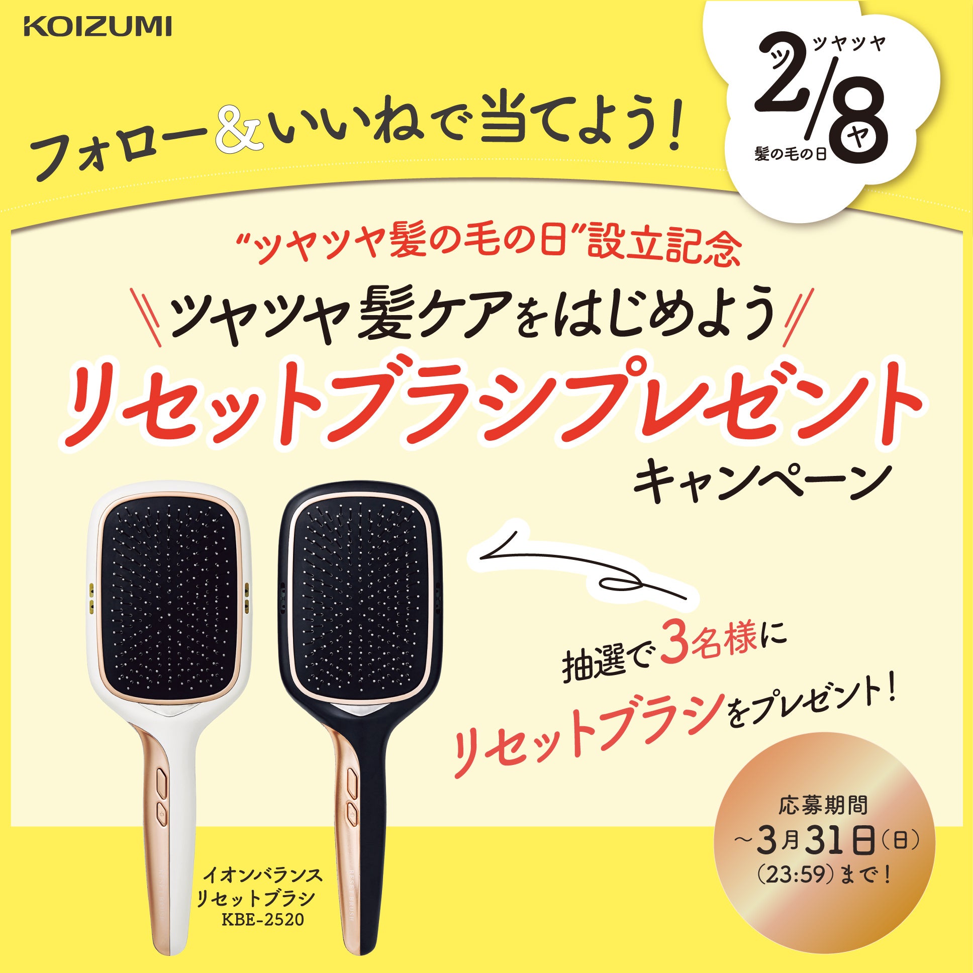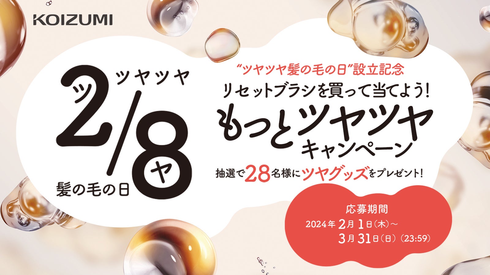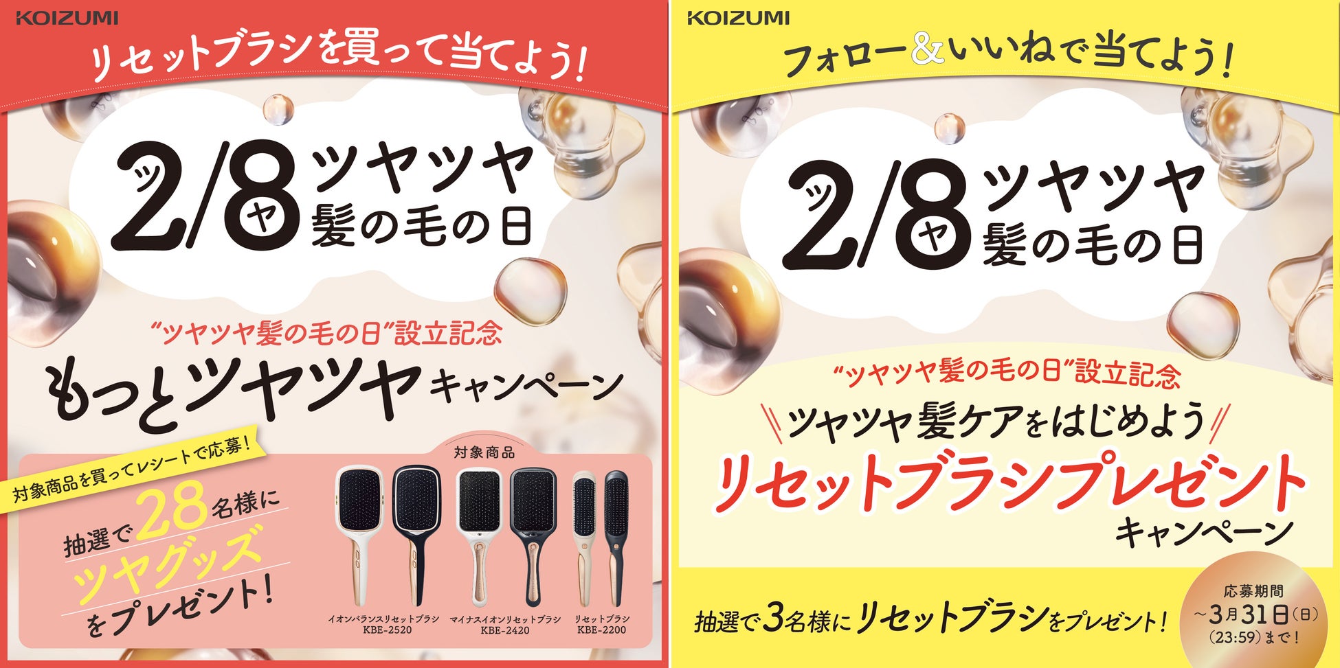 理美容器具などの自社商品の企画・開発と、国内外のメーカーブランド商品を取扱い、販売する代理店業を展開する小泉成器株式会社(本社:大阪市中央区備後町、代表取締役社長:橋本直志)は、独自の記念日【2月8日"ツヤツヤ髪の毛の日"】設立を記念して2つのキャンペーン「リセットブラシを買って当てよう!もっとツヤツヤキャンペーン」と「フォロー&いいねで当てよう!リセットブラシプレゼントキャンペーン」を2024年2月1日(木)~3月31日(日)23:59の期間で実施します。
