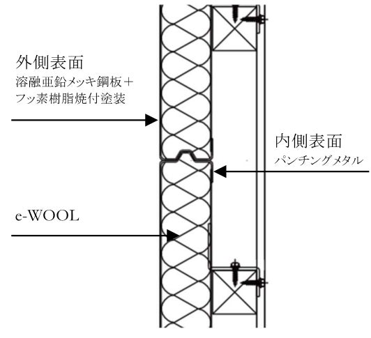 新たに発売した「e-WOOL 防音パネルFS」は、従来の「e-WOOL 防音パネル」よりも遮音性・耐候性を向上させた複合型の防音パネルです。外側表面には板厚1.6 ㎜の溶融亜鉛メッキ鋼板を使用することにより、D-35 相当の遮音性能を実現。さらにフッ素樹脂焼付塗装することで耐候性も向上、長きにわたりご使用いただけます。パネル内部には、ポリエステル繊維の多孔質構造吸音材「e-WOOL」を使用。吸音性・透水性にすぐれており、雨水の侵入による劣化も防ぐことができます。