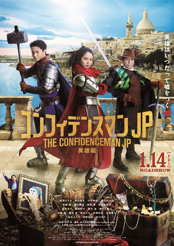 ・ストーリー:これは、コンフィデンスマン誕生の秘密に迫る物語——“英雄”と謳われた詐欺師〈三代目ツチノコ〉が死んだ。その元で腕を磨いた過去を持つダー子、ボクちゃん、リチャード。当代随一の腕を持つコンフィデンスマンによって密かに受け継がれる〈ツチノコ〉の称号をかけ、3人の真剣勝負がはじまる。舞台は世界中のセレブが集まる世界遺産の都市〈マルタ島・ヴァレッタ〉。狙うは、莫大な財を成し引退したスペイン人の元マフィアが所有する、幻の古代ギリシャ彫刻〈踊るビーナス〉。それぞれの方法でオサカナに近づく3人だったが、そこに警察さらにはインターポールの捜査の手が迫っていた・・・。果たして最後に笑うのは誰なのか!?まったく先の読めない史上最大の騙し合いが始まる!!そして、本当の〈英雄〉、最後の〈真実〉とは――!?