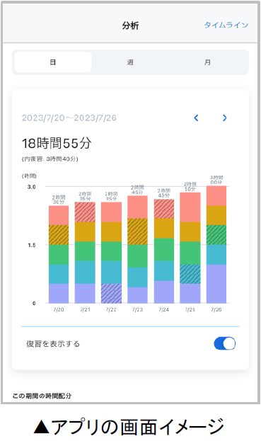 日々の学習の記録をグラフで視覚的に確認できます。毎日の努力が目に見えて分かるので、モチベーションの維持につながります。