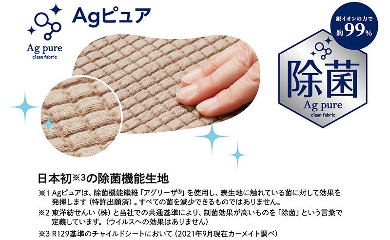『Agピュア』は生地に付着した菌を銀イオンの力で約99%除菌※2する当社独自開発の生地(特許出願済)。赤ちゃんが舐めたり触る、新生児クッションのヘッド側面と肩ベルトカバー、よだれパッド、食べかす等のゴミが溜まりやすい本体カバー座面に採用。舐めても安心、玩具の安全性に関する欧州規格『EN71-3』をクリアしたふわふわのワッフル調生地で優しい肌触り