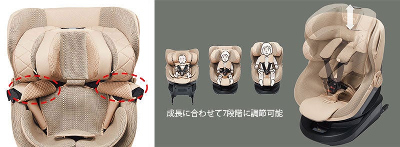 ヘッドレスト上部のレバーを操作することで、肩ベルトとヘッドレストの高さをお子様の成長に合わせて調節可能(下画像:右)