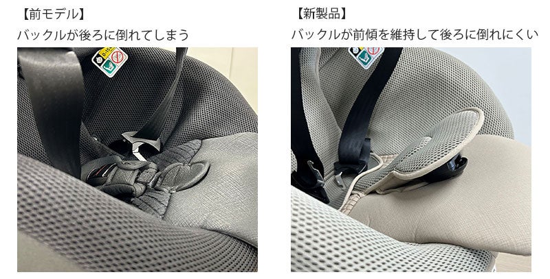 股ベルト(バックル)が前傾を維持する縫製カバーを採用。バックルがお尻の下敷きになる煩わしさがなくなり、お子様をより効率よくチャイルドシートに乗せることが可能に