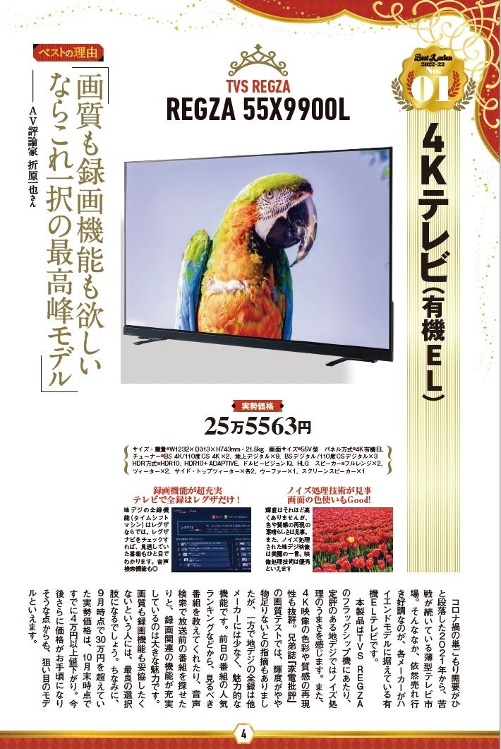 TVS REGZAのフラッグシップ機にあたり、定評のある地デジではノイズ処理のうまさを感じます。また、4K映像の色彩や質感の再現性も抜群。地デジの全録は他メーカーには少なく、魅力的な機能です。前日の番組の人気ランキングなどから、見るべき番組を教えてくれたり、音声検索で放送前の番組を探せたりと、録画関連の機能が充実しているのは大きな魅力です。画質も録画機能も妥協したくないという人には、最良の選択肢になるでしょう。ちなみに、9月時点で30万円を超えていた実勢価格は、10月末時点ですでに4万円以上値下がり。今後さらに価格がお手頃になりそうな点からも、狙い目のモデルといえます。