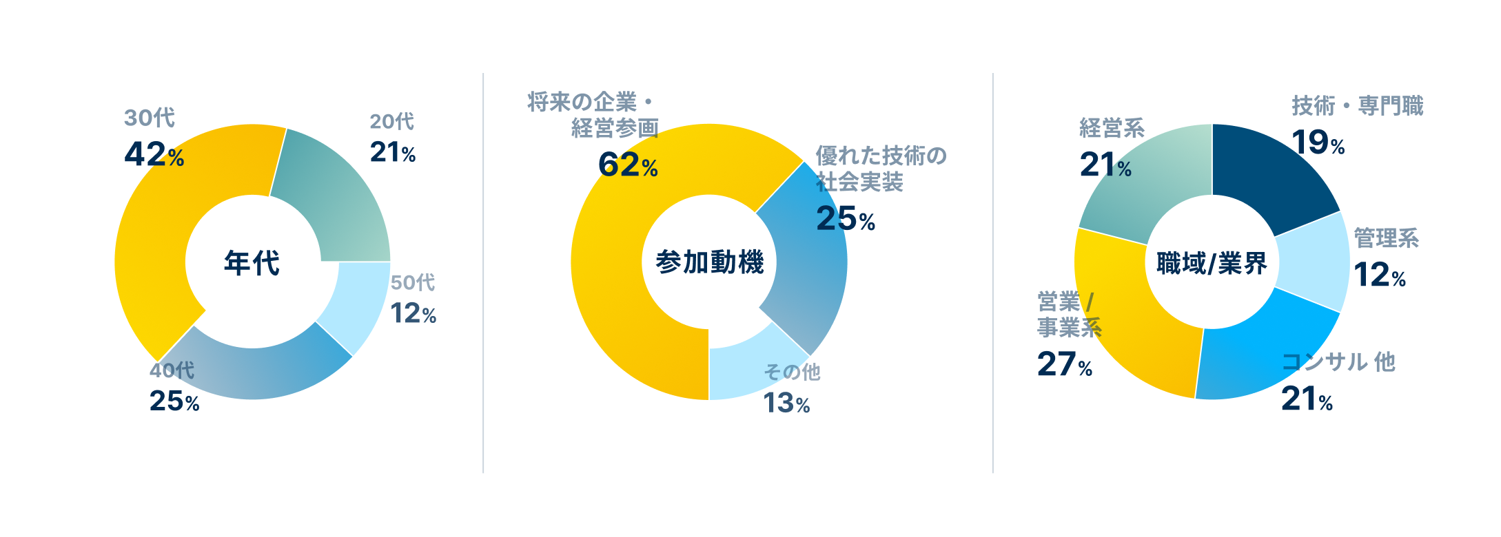 ・将来的にスタートアップの創業や経営に関わりたいビジネスパーソン100名(短期的に目指している方だけでなく、将来的なキャリアとしてという方も対象)