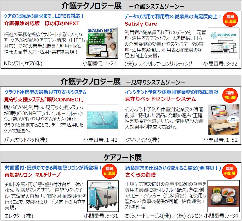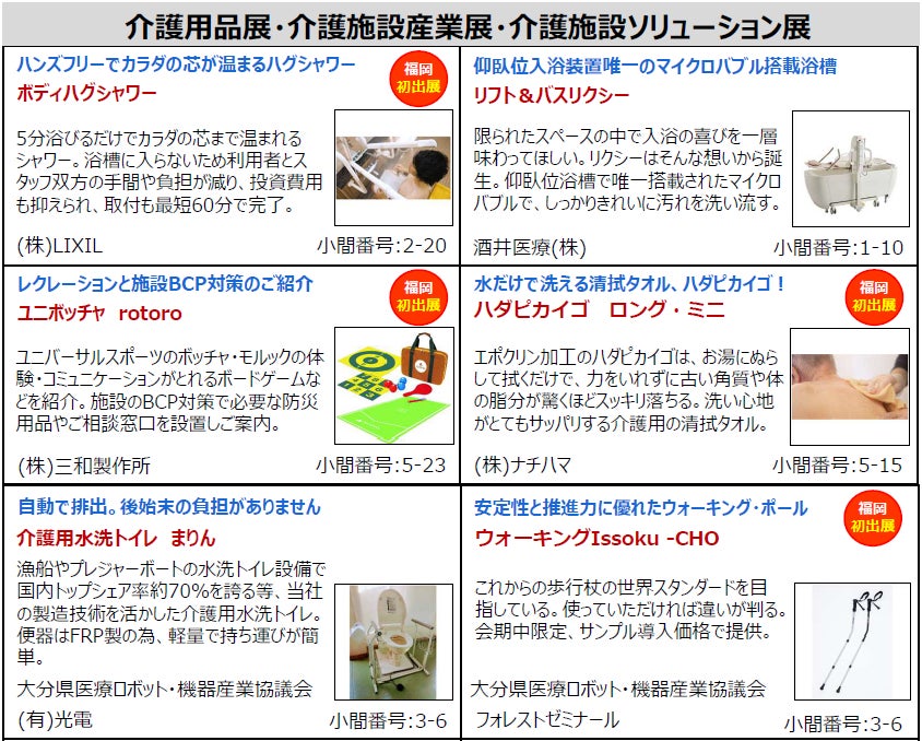 本展には、福岡を拠点とする地元企業や、全国対応可能な企業など主要企業が多数出展。最新の介護用品やリハビリ機器、ロボット、介護システムや見守りシステムのほか、介護・高齢者施設向けの人材サービス、ケアフードなどが集結し、介護事業者が商品選定や商談を目的に来場する。