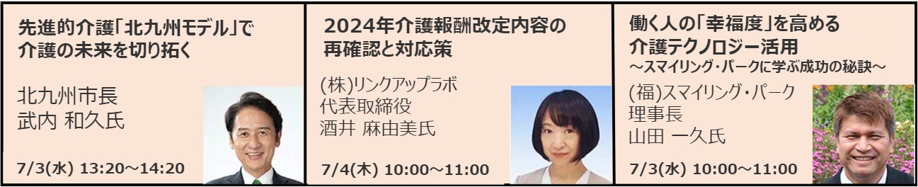 本展では業界の第一線で活躍する専門家を講師に迎え、全11コース28セッションの「専門セミナー」を同時開催する。基調講演には先進的介護「北九州モデル」で知られる北九州市の武内和久市長が登壇し、介護の未来について語る。その他、令和6年度介護報酬改定の対応策や介護DX、人事戦略など経営に関わる重要テーマから、ケアマネジメント、介護予防など介護職のスキルアップに役立つ実践的なテーマまで、介護の様々な課題解決に直結するセミナーが目白押し。受講申込(無料)は公式サイトにて受付中。定員間近のセッションもあるため、早めの申込をおすすめする。