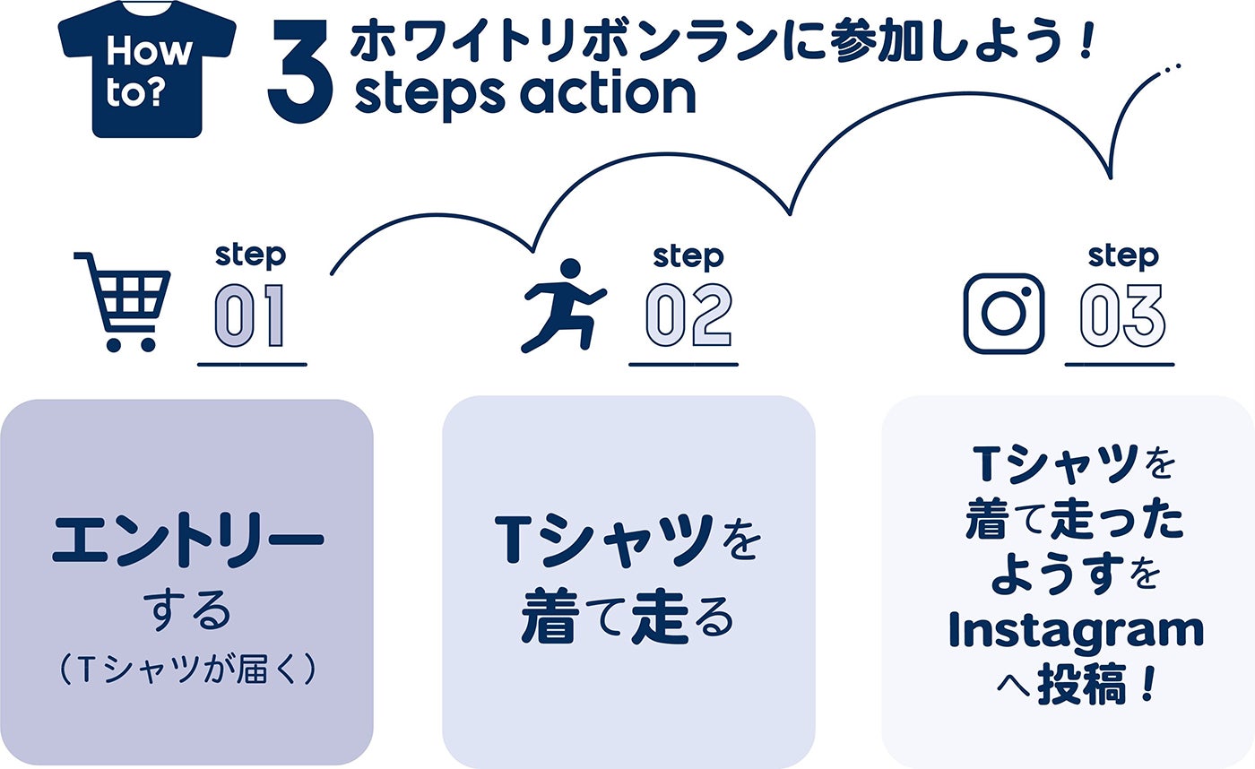 エントリー費の収益全額が寄付となり、年齢、性別を問わずどなたでもエントリーすることで参加が可能です。参加賞として届いた公式Tシャツを着て、ホワイトリボン月間(3月1日~3月31日)中に走ったり歩いたりして、チャリティアクションをします。