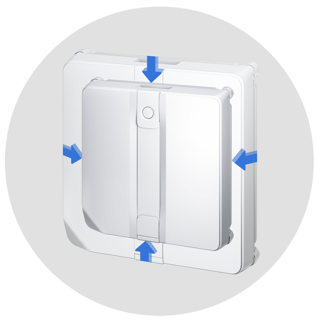 さまざまな形の窓に柔軟に対応できるよう、最適な設計を施しました。 前モデルWINBOT W2からさらなる小型化を徹底、バンパーレス化や デュアルエアダクトの最適化など内部構造を見直すことで、1辺28mm減 の215mm・厚さ3mm減の55mmというコンパクトボディを実現しました。窓の縁までよりスムーズに移動できるようになり、複雑な窓構造にも 対応しやすく、手が届きにくい部分までしっかり拭き取れるようになり ました。小型化で持ち運びが容易になり、収納場所も選びません。