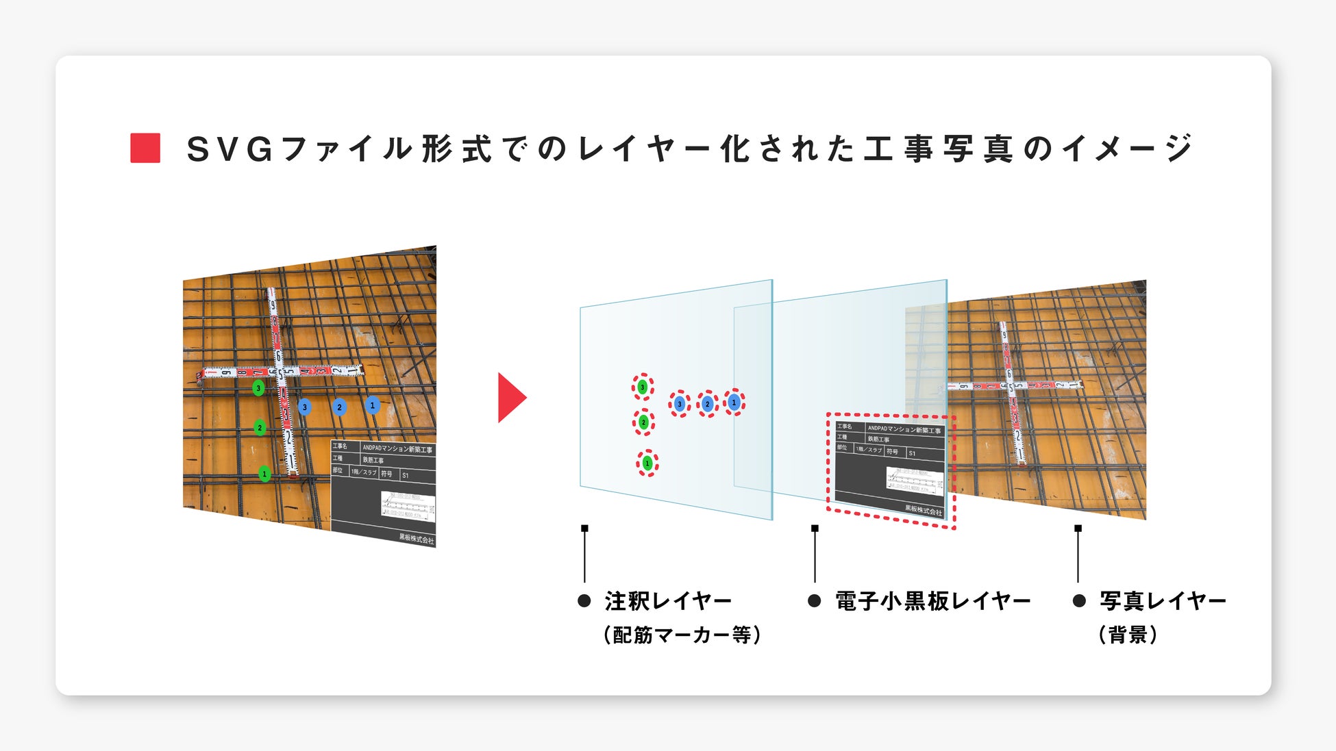 SVGファイル形式は、工事写真に複数のレイヤーを重ねて保存できる形式です。これにより、原本画像の信憑性を保ちながら、(配筋マーカー※等)や電子小黒板を別のレイヤーに保存できます。