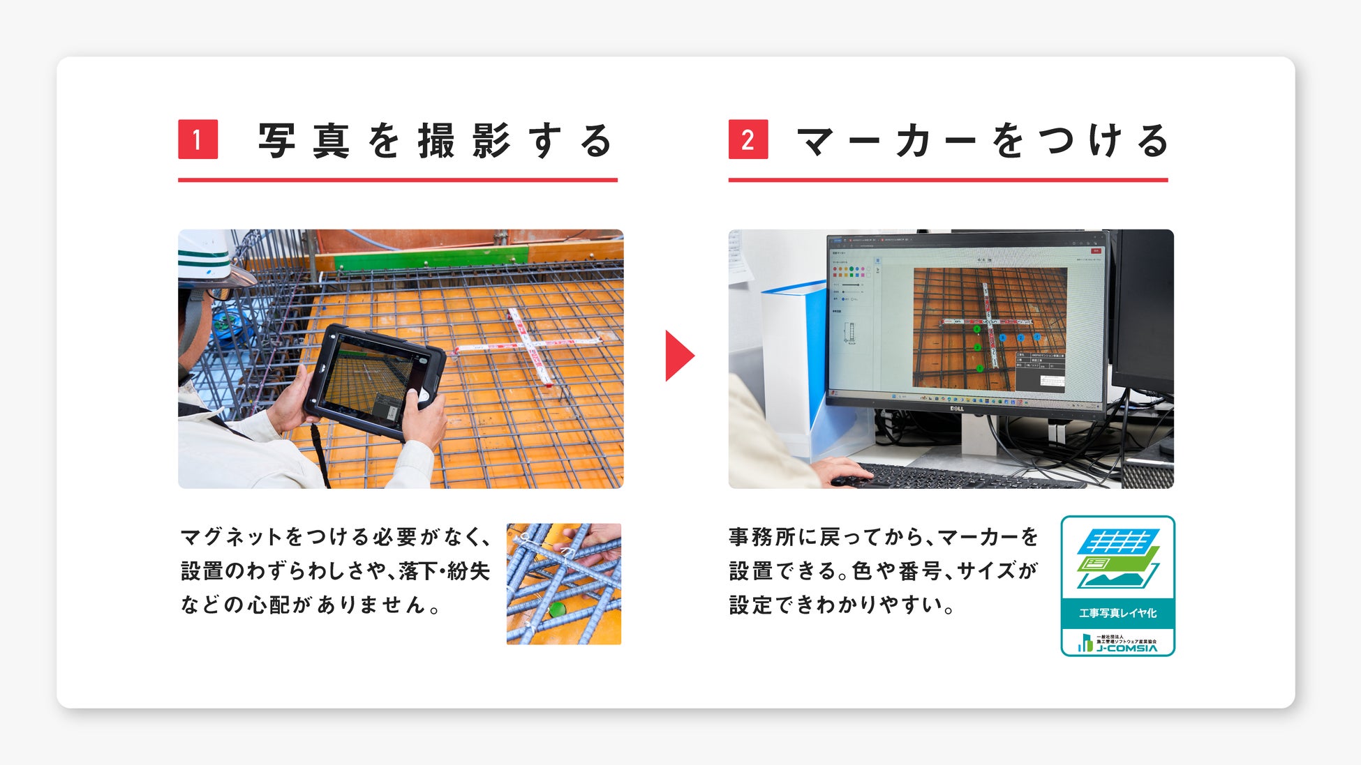 「配筋マーカー」は、撮影済みの鉄筋写真に電子マーカーを付与し、それらの写真を用いて台帳を作成したり、写真のダウンロードができる機能です。