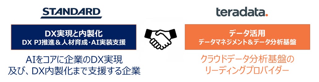 東京発 – 2022年6 月1日 - エンタープライズ・アナリティクス向けコネクテッド・マルチクラウド・データプラットフォーム「Teradata Vantage」を提供するテラデータ(NYSE: TDC)の日本法人 日本テラデータ株式会社(本社:東京都港区、代表取締役社長:髙橋 倫二、以下テラデータ)は、600社以上のデジタルトランスフォーメーション(以下DX)におけるコンサルテーション、内製化に携わり、豊富な知見と実績をもつ株式会社STANDARD(本社:東京都千代田区、代表取締役社長:櫛野恭生、以下STANDARD)と協業し、製薬会社向けにDXプロジェクトの戦略立案、推進からDX⼈材育成、データ分析基盤の構築、AI実装・運用、内製化までを一気通貫で支援するサービスの提供を発表します。