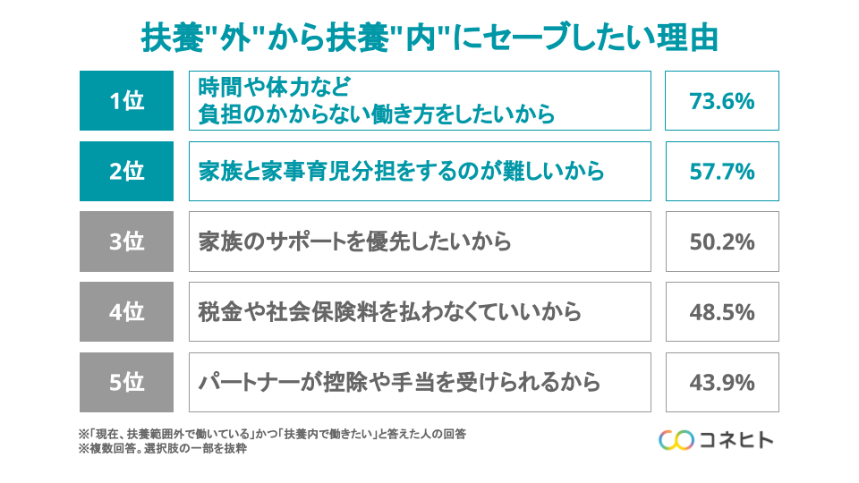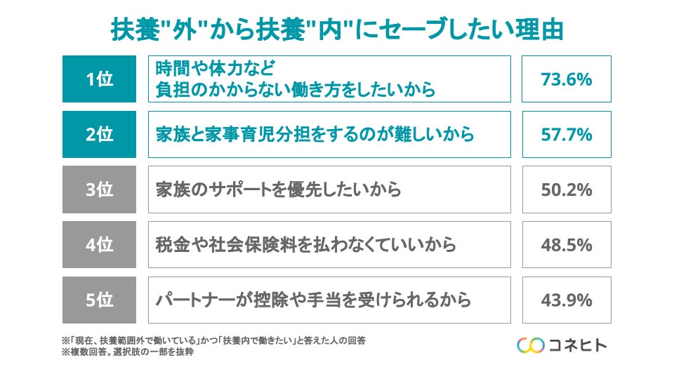 「あなたの家族像が実現できる社会をつくる」をビジョンに掲げるコネヒト株式会社(本社:東京都港区、代表取締役 高橋 恭文、以下「コネヒト」)は、働く女性を対象に「年収の壁についてのアンケート」を実施しました。当調査では扶養範囲外で働く女性の5人に1人が「できれば扶養内で働きたい」と回答。その理由からは、パートナーの長時間労働によって女性側へ家事育児負担が重くのしかかり、働き方を変更して仕事をセーブしたいという意向がうかがえます。