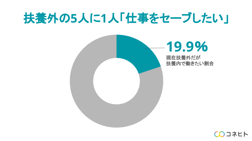 現在、扶養範囲外で働く人のうち、扶養内での働き方を希望している割合は19.9%。つまり5人に1人は勤務時間を減らすなどして、仕事をセーブしたいと考えていることがわかりました。