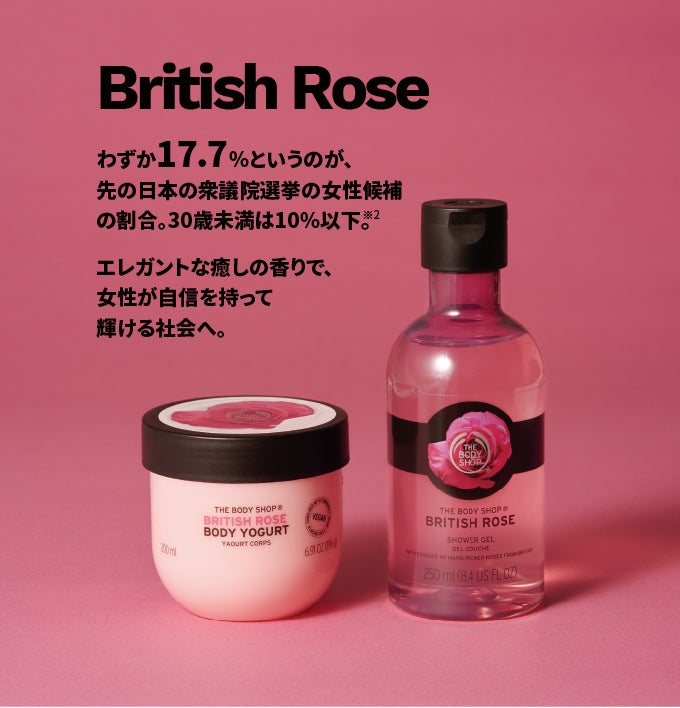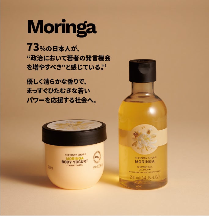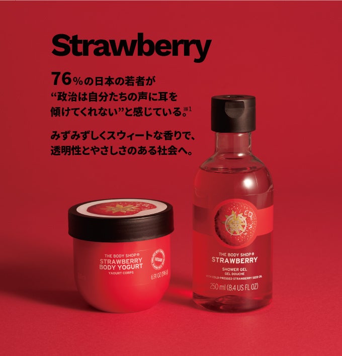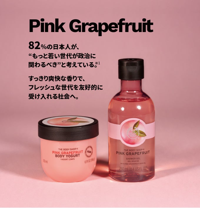 ザボディショップのブランドビジネスにおいて重要な市場である日本では、「若者(特に女性)が政治に参画することを妨げている様々なバリア(障害)を取り除く活動を行っていきます。1 年目となる今年は、「年齢のバリア(障害)」を取り除くべく、ひとつの大きな目標として、まず“被選挙権年齢の引き下げ” を掲げることといたします。日本では、選挙権年齢が2016 年より18 歳に引き下げられ、今年4 月から民法上の成人年齢も18 歳となりましたが、被選挙権年齢においては、衆議院は25 歳、参議院は30 歳と高く、若者の政治参画を妨げるバリアとなっています。そこで、若い世代の声を政治に反映させるために邁進している一般社団法人「日本若者協議会」に賛同。キャンペーンで展開するスペシャル限定キットの売上げの一部を、彼らが行っている、被選挙権年齢の引き下げを求める法案成立に向けた活動の支援に充てることを決めました。