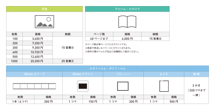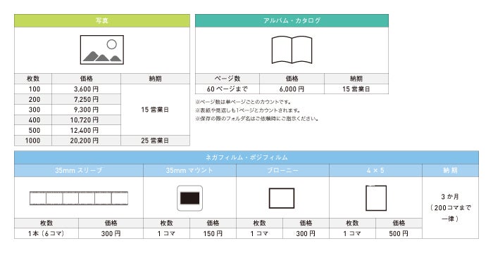 写真、ネガ・ポジフィルム、アルバムやカタログに特化し、家庭用プリンターやコンビニエンスストア等で出力できる簡易的な出力データに変換いたします。