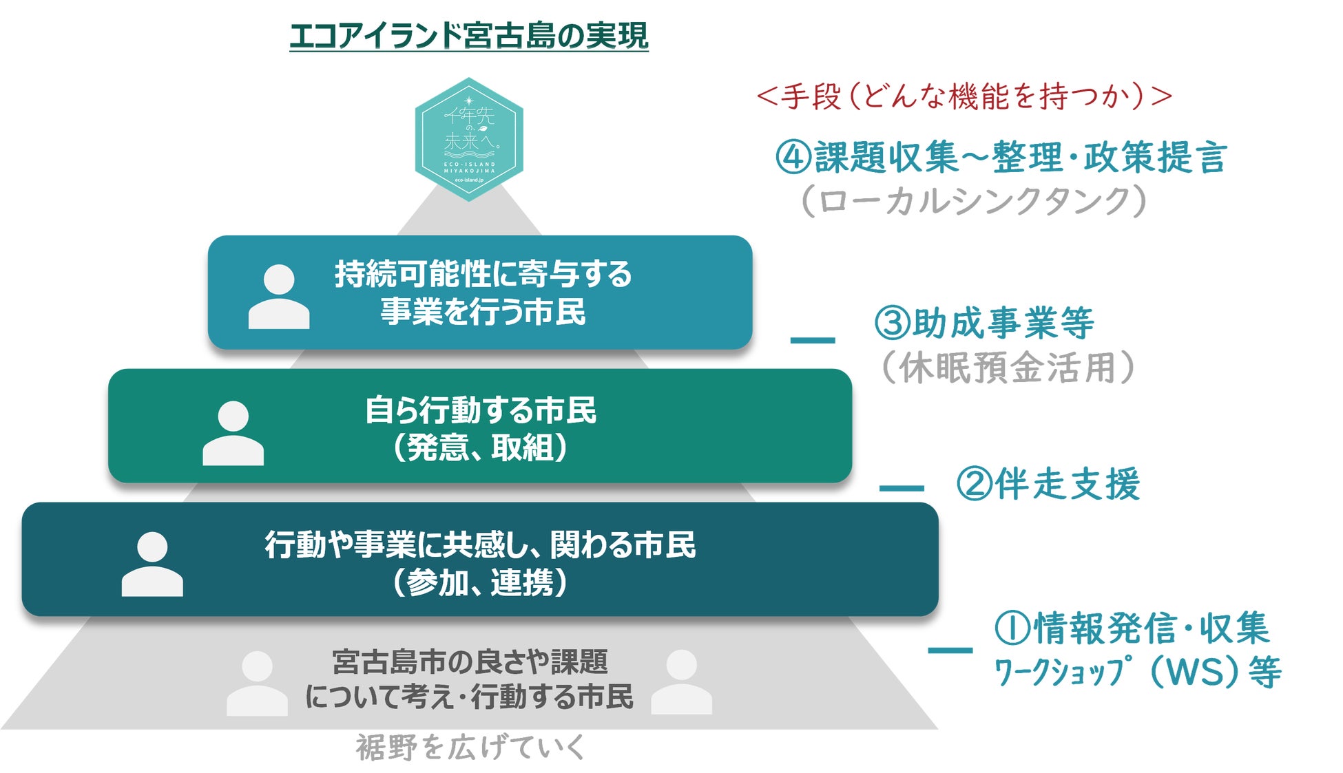 千年PFは、「「環境×経済×社会」の統合的な視点を持った地域の持続可能性=エコアイランド宮古島の実現を目指す」をビジョンに掲げています。市民発意の事業に対する伴走支援および助成事業の実施、解決すべき地域課題・活かせる地域資源の発掘を目的とした情報発信・収集(地域回り、相談受付等)、課題整理や政策提言等(ローカルシンクタンク機能)を主な事業内容としています。