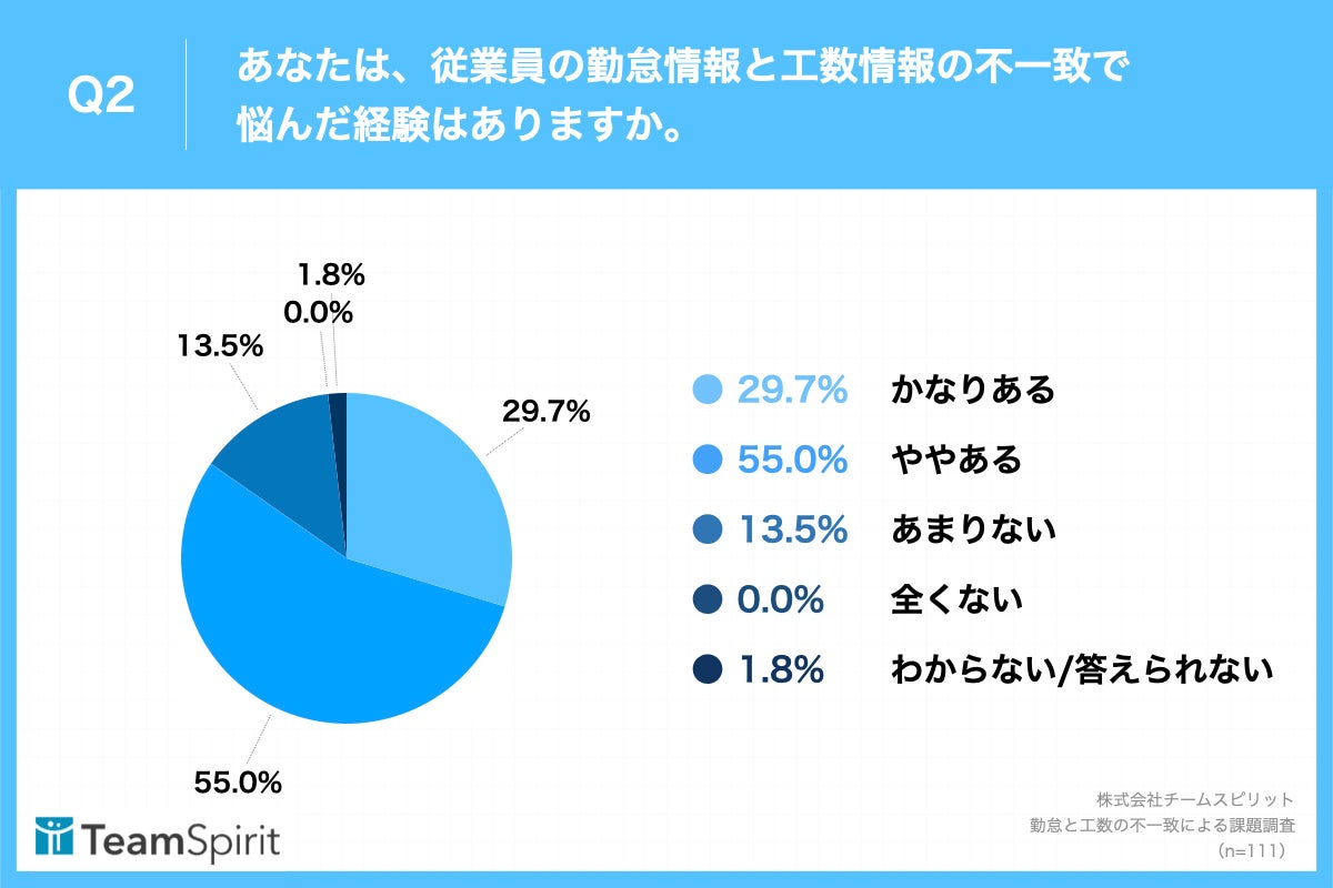 「Q2.あなたは、従業員の勤怠情報と工数情報の不一致で悩んだ経験はありますか。」(n=111)と質問したところ、「かなりある」が29.7%、「ややある」が55.0%という回答となりました。
