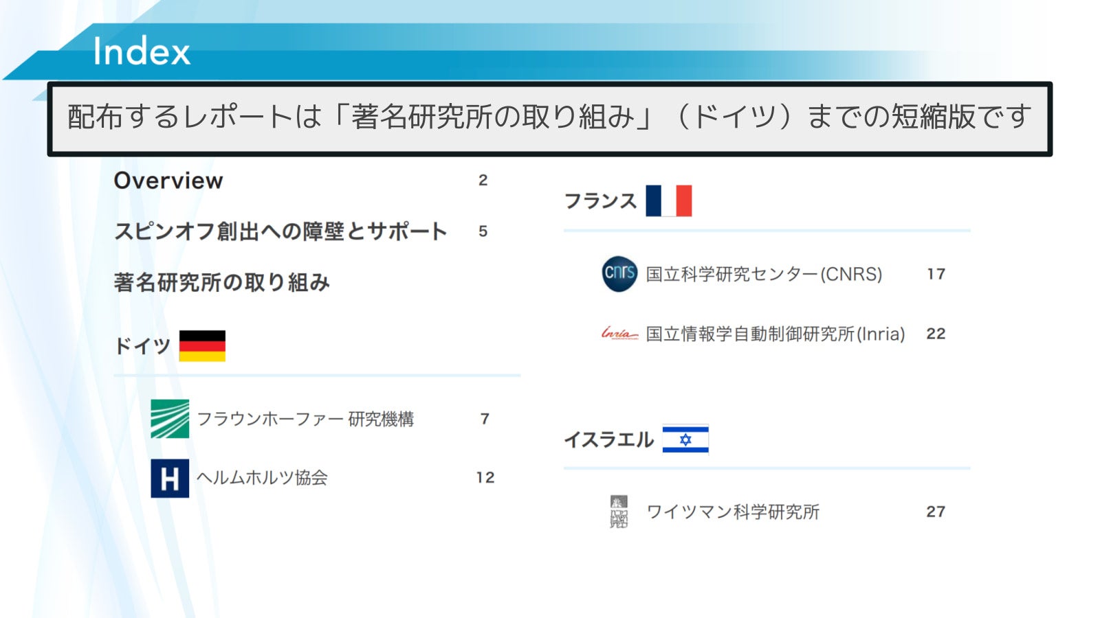 本レポートでは、技術移転オフィスを設置し、技術移転プログラムを通して研究成果の商用化とスピンオフの育成を積極的に進めているドイツのフラウンホーファー研究機構とヘルムホルツ協会、フランスのCNRSとInria、そしてイスラエルのワイツマン科学研究所に注目しました。これらの研究所の取り組みの一部を取り上げながら、各研究所からのスピンオフ企業を紹介してまいります。