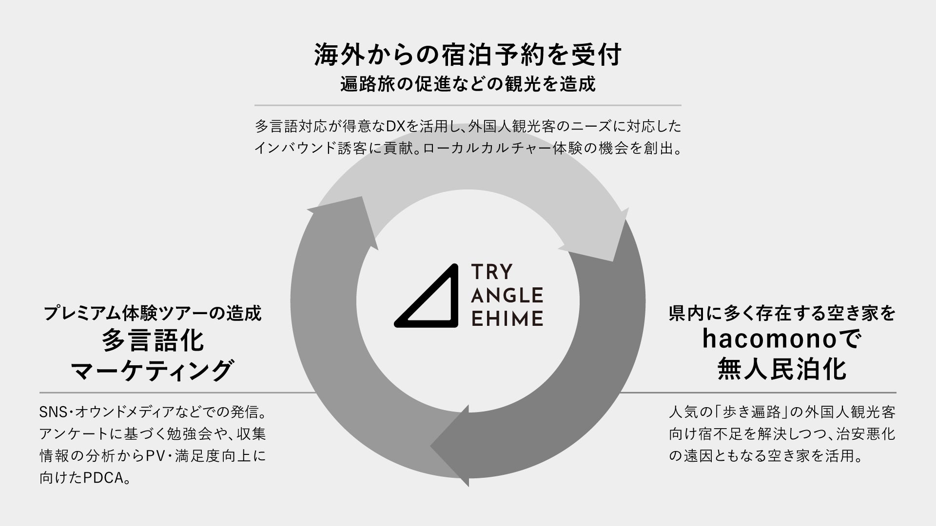 愛媛県デジタルシフト推進課は、トライアングルエヒメ推進事業を通じて、令和6年度の新規プロジェクトを募集したところ、全国から過去最多の335件の応募を受け付けました。厳正な審査を実施し、当社の「無人民泊システム導入によるインバウンド向け遍路宿の環境整備」を含む20件を新規採択しました。