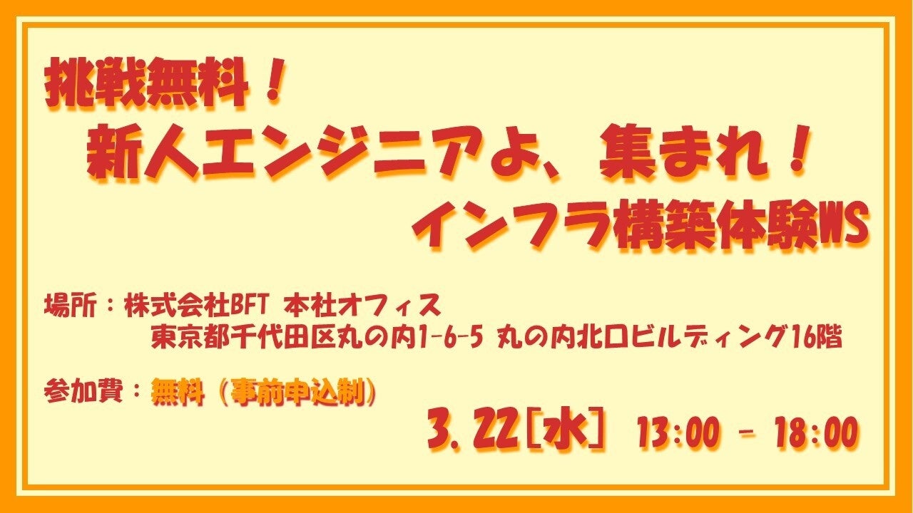 インフラエンジニアをワークショップを通して「体験」できるイベント「挑戦無料!新人エンジニアよ、集まれ!インフラ構築体験WS」をオフラインで開催決定3月22日(水)13時~@BFT本社16階
