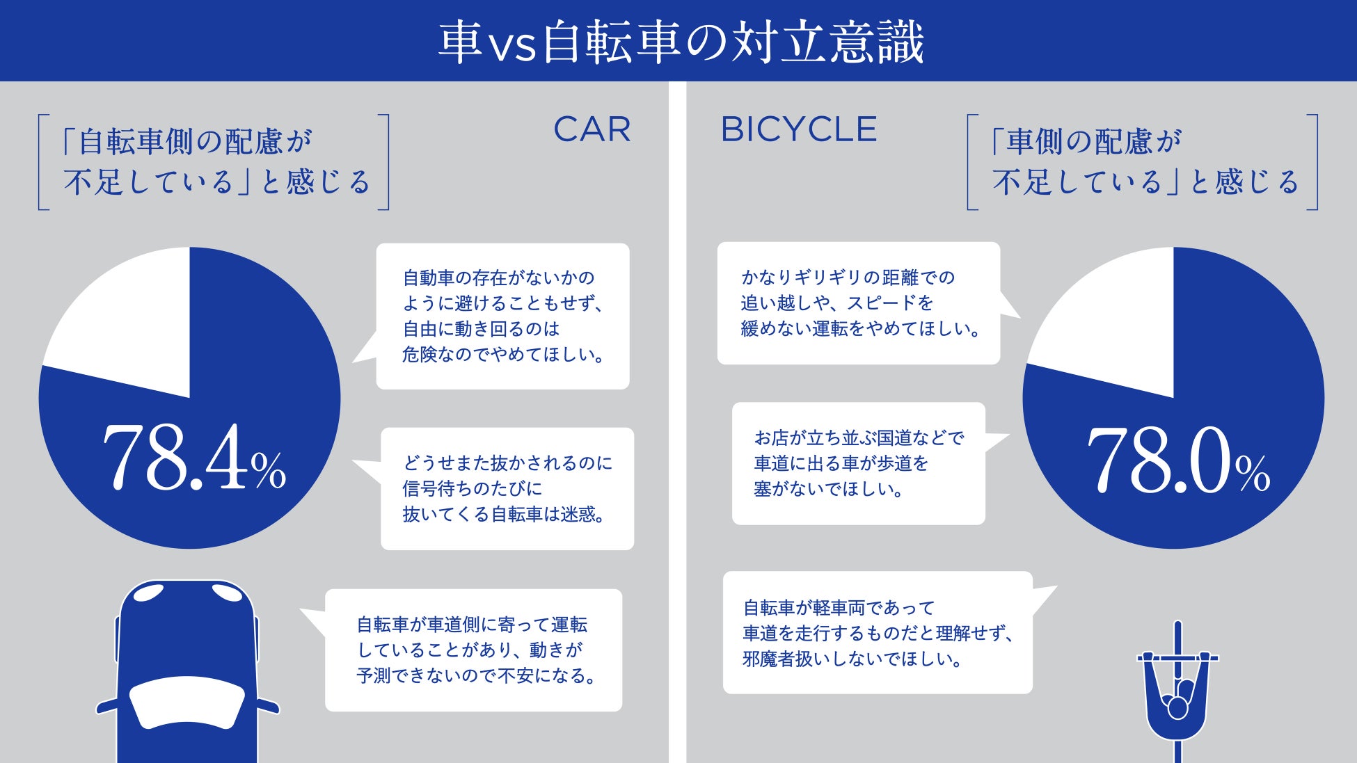 車と自転車の双方の約8割が「相手に配慮してほしい」、「もっと事情を理解してほしい」と回答。